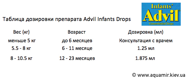 Нестероидное противовоспалительное и обезболивающее средство (NSAID) для младенцев от 6 до 24 месяцев (5.5 - 10.5 кг) Адвил (Advil) содержит активное вещество ибупрофен (50 мг на 1.25 мл), которое является производным молекулы фенилпропионовой кислоты. Действующий компонент устраняет воспаление, провоцирует анальгезию, снижает температуру.